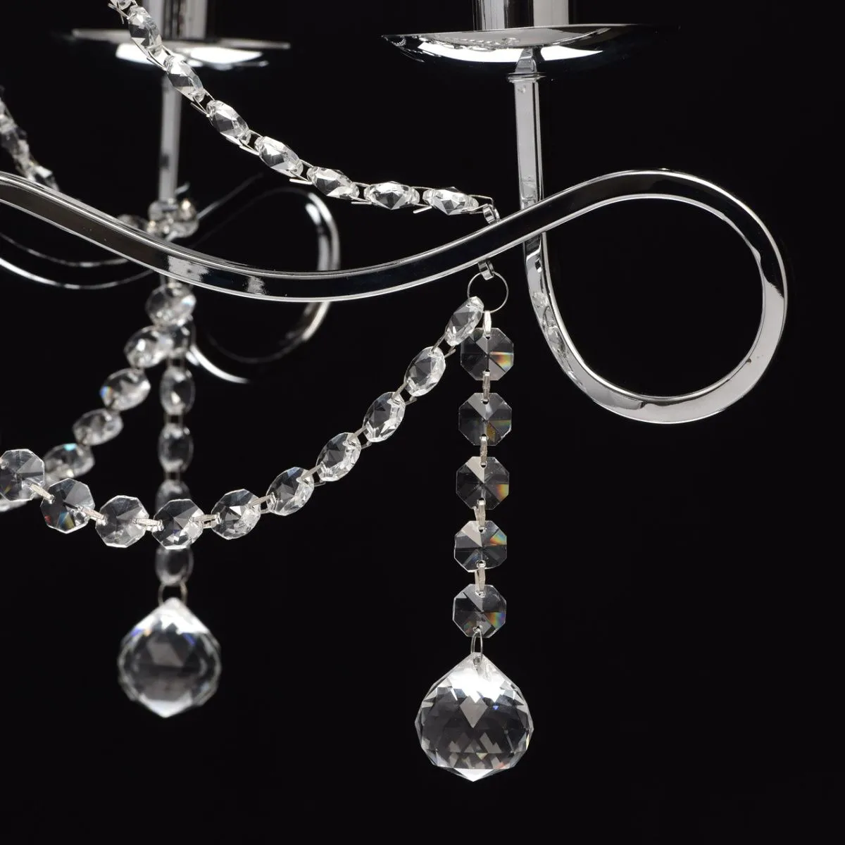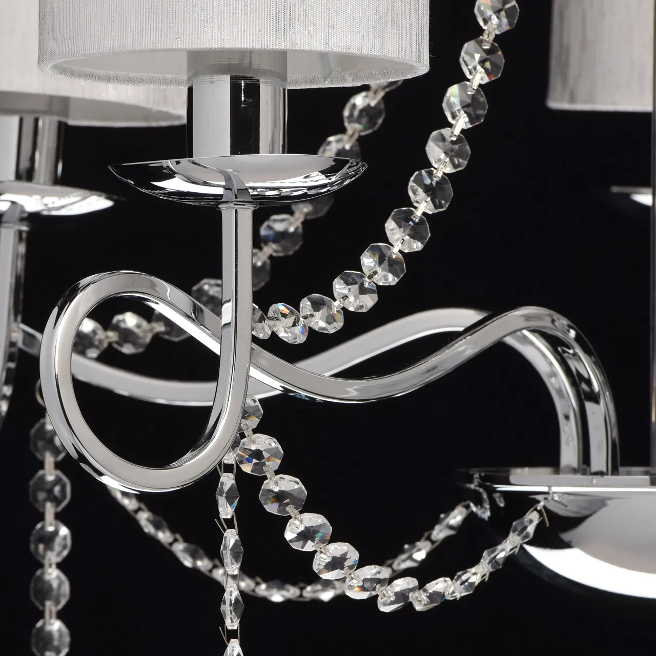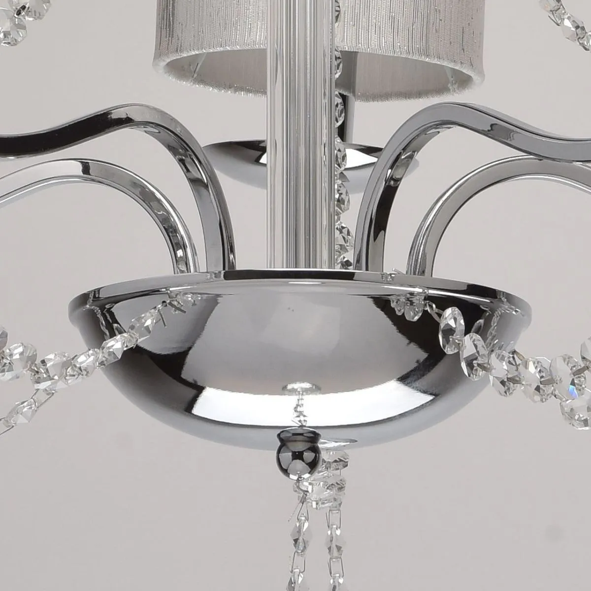 Металлическое основание цвета хрома. Плафоны: парча серебрянного цвета. Декор - хрусталь